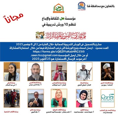 تنظم ادارة مهرجان قنا للفنون والحرف التراثية والذى تنظمه مؤسسة س للثقافة والابداع بالتعاون مع محافظة قنا 10 ورش تدريبية خلال فعاليات الدورة الاولى والتى تقام خلال الفترة من 5 الى 8 نوفمبر المقبل.